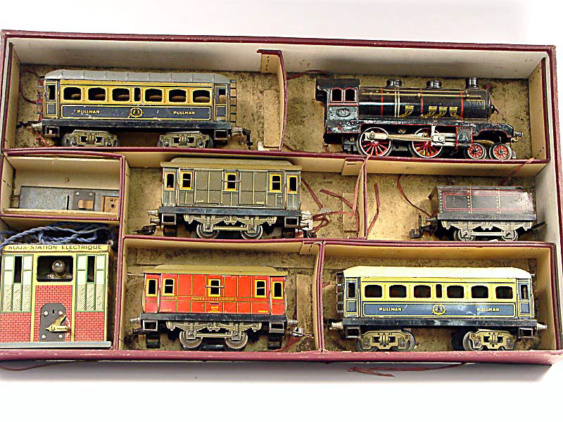 contient : une locomotive vapeur électrique type 220 avec tender (non conforme à la locomotive), 2 voitures PULLMAN de voyageurs, un wagon fourgon 'POSTES & TELEGRAPHES', un wagon fourgon à bagages & un transformateur intégré dans un poste de sous-station électrique - états de 'C' à 'E' - petits manques & restaurations divers - manque couvercle de coffret