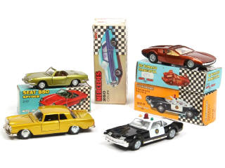 comprend : OLDSMOBILE TORONADO 'POLICIA' (quelques manques de pellicule chromée), SEAT 850 SPYDER, DE TOMASO MANGUSTA & MERCEDES 250 coupé