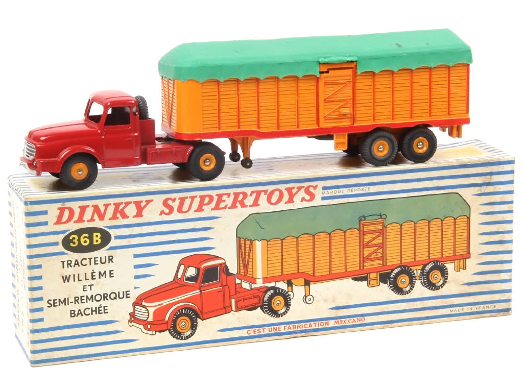 DINKY TOYS (FRANCE) 36B WILLEME Semi-remorque bâché (version avec jantes convexes) rouge & orange, bâche verte