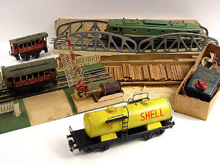 comprend : une motrice électrique type CC 7001 (avec nombreux manques), 2 voitures de voyageurs de marque J de P, un transformateur référence 5828, un passage à niveau (incomplet) & un pont suspendu double - on y joint une boîte de rails à monter soi-même 'LE RAIL BATIMETAL' & un wagon citerne 'SHELL' de marque inconnue (en état 'F')
