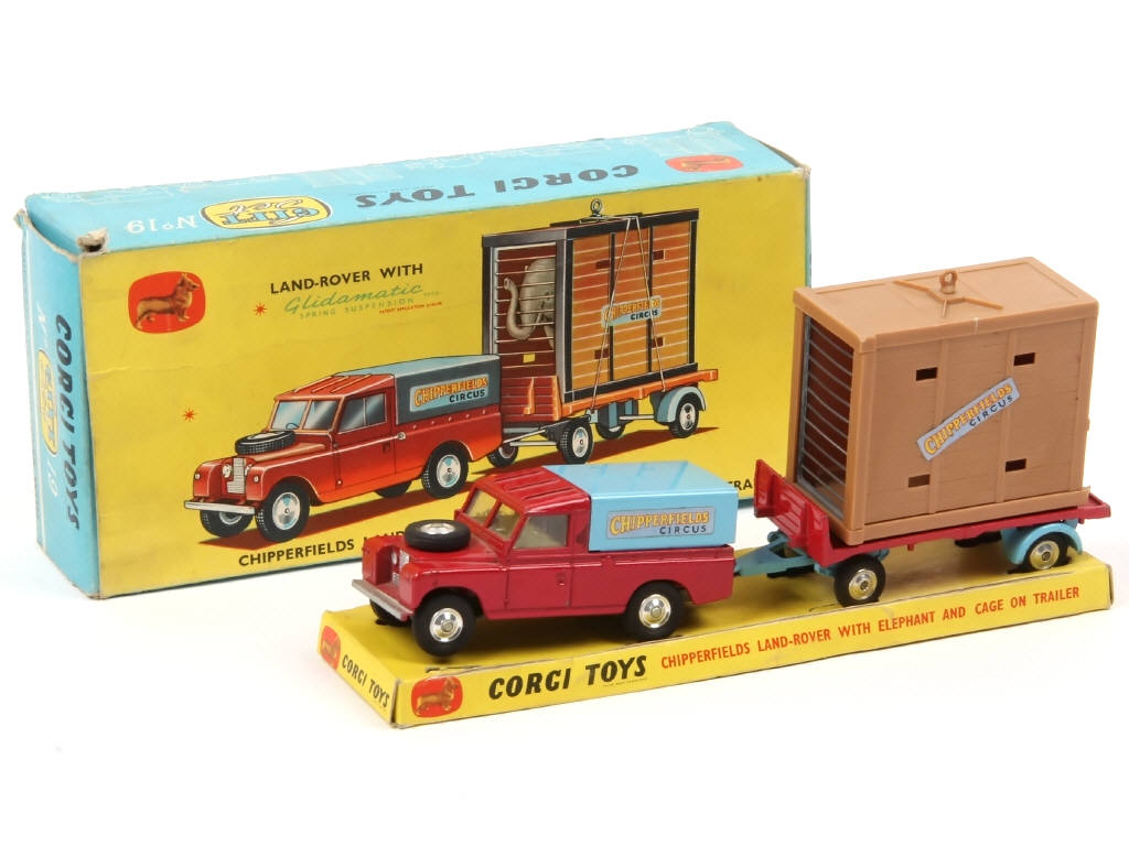 CORGI TOYS (GB) GS19 LAND ROVER Pick-up bâché 'CHIPPERFIELD' avec remorque cage à éléphant rouge & bleu