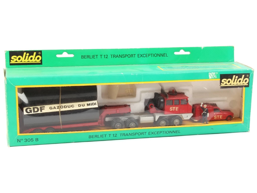 contient : BERLIET T12 'STE' semi-remorque avec chargement (autocollants & décalques plus ou moins tachés & incomplets), RENAULT 4 fourgonnette 'STE', planche de décalques & une figurine - blister de boîte en partie décollé (quelques accrocs) - ensemble plus ou moins encrassé - possibilité de petits accessoires manquants