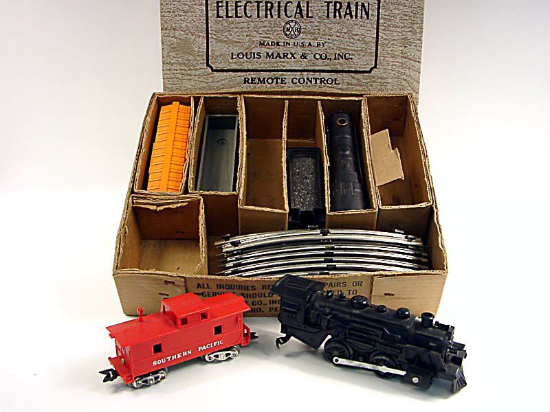 contient : une locomotive à vapeur type 020 avec tender 'SOUTHERN PACIFIC LINES', un wagon tombereau 'PENNSYLVANIA', un wagon fourgon 'BALTIMORE & OHIO', un wagon de queue 'SOUTHERN PACIFIC' & 10 rails courbes - on y joint une locomotive à vapeur du même type en tôle sans tender - manque vraisemblablement le transformateur