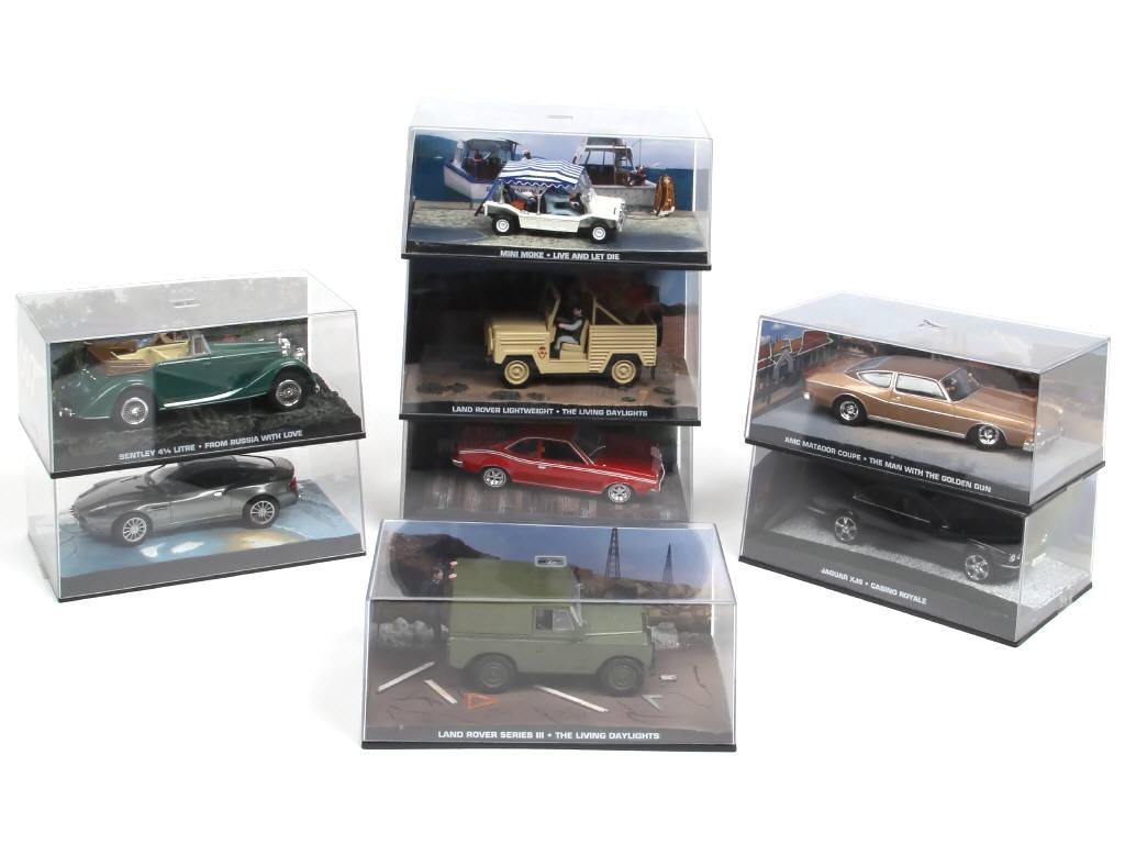 collection 'JAMES BOND' - avec dioramas - miniatures reproduisant notamment les modèles : ASTON MARTIN, LAND ROVER & BENTLEY - tiré notamment des films : 'CASINO ROYALE', 'L'HOMME AU PISTOLET D'OR' & 'TUER N'EST PAS JOUER'