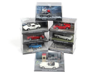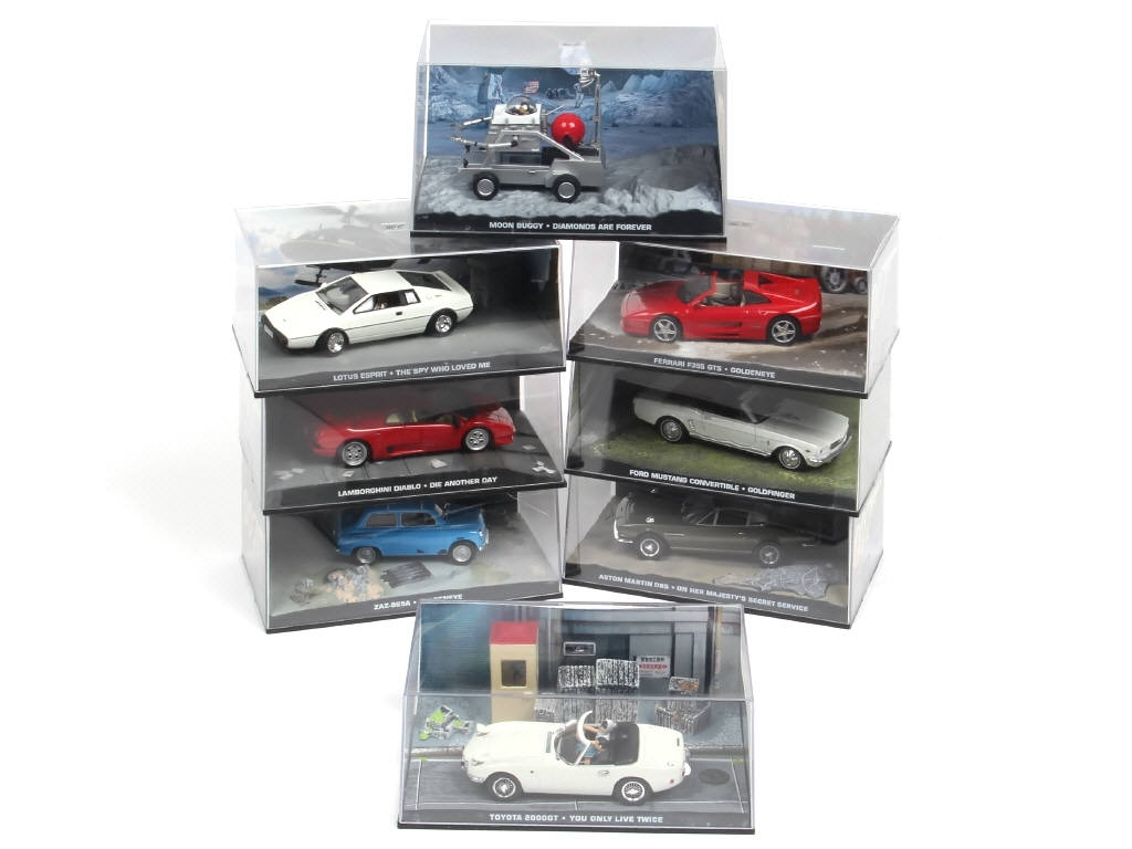 collection 'JAMES BOND' - avec dioramas - miniatures reproduisant notamment les modèles : TOYOTA, LAMBORGHINI, FORD & ASTON MARTIN - tiré notamment des films : 'GOLDEN EYE', 'GOLDFINGER', 'AU SERVICE SECRET DE SA MAJESTE' & 'LES DIAMANTS SONT ÉTERNELS'