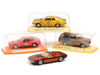 comprend : DE TOMASO MANGUSTA (sans boite), MATRA S rallye (boite fêlée), OPEL MANTA rallye & RANGE ROVER SAFARI (roues collées sur le socle)