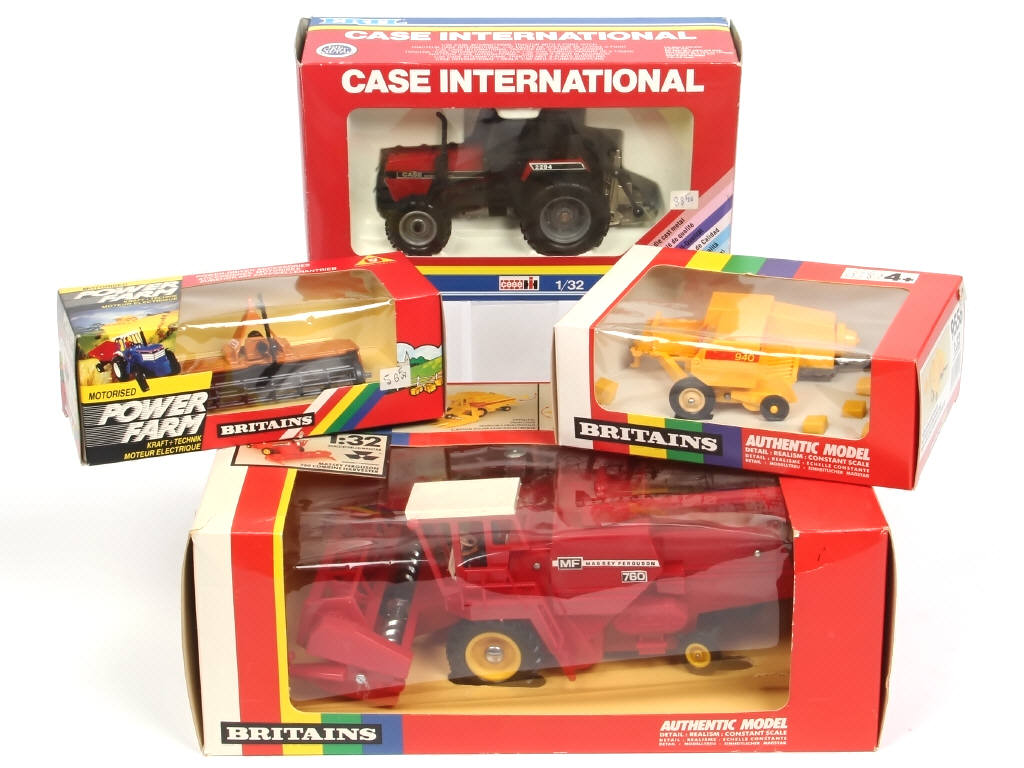 échelle 1/32ème - comprend les références : 9570 (direction par la cheminée - avec conducteur - blister de boite décollé), 6556 & 9343 - on y joint un tracteur agricole CASE INTERNATIONNAL de la marque ERTL