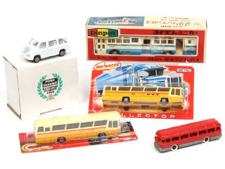 comprend notamment : autocar 'PTT SUISSES', CHAUSSON & FORD TRANSIT - on y retrouve les marques : MAJORETTE, CLE & YONEZAWA TOYS DIAPET - 4 modèles en boites état 'b'