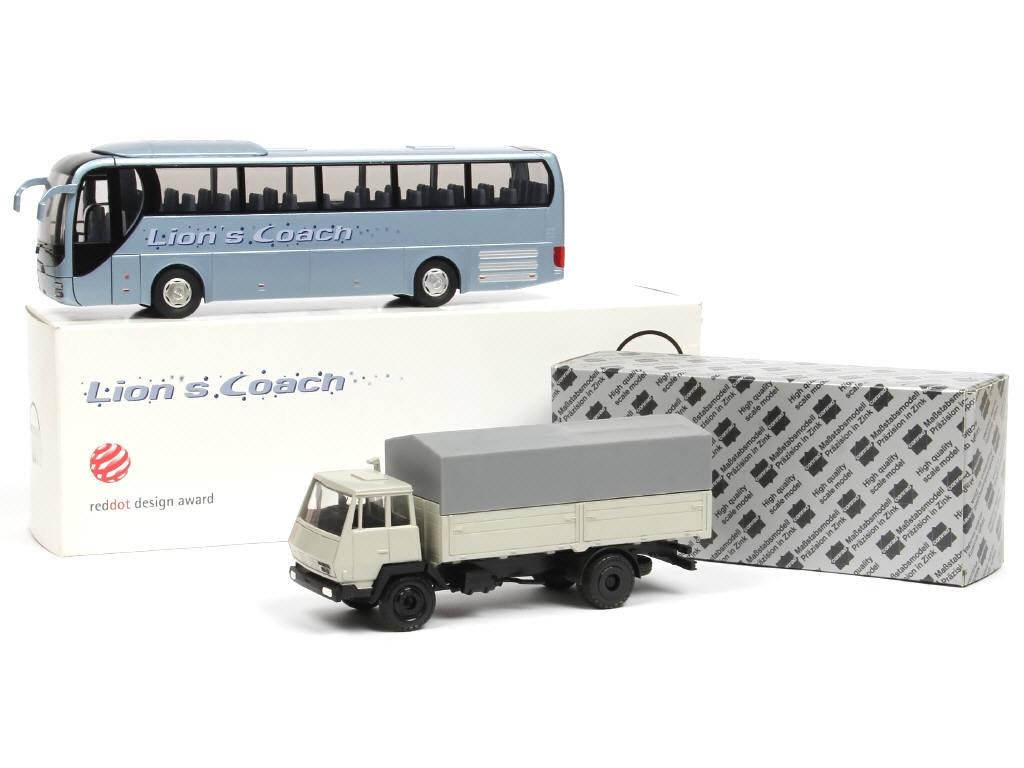 comprend : autocar MAN 'LION'S COACH' (référence 5430/0) & STEYR 91 camion à ridelles hautes bâché (référence 3432)