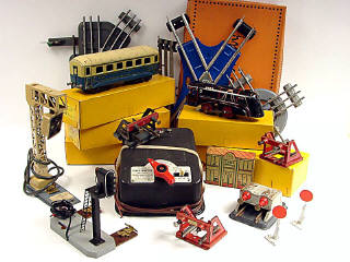 états de 'C' à 'F' - comprend : un locomotive à vapeur de type 020, une voiture de voyageurs PULLMAN, un transformateur référence 6056 U, un croisement oblique mécanique avec sa boîte, un signal d'arrêt automatique avec une partie de sa boîte, 4 butoirs, une petite façade de gare en tôle lithographiée, 5 boîtes vides de wagons, une potence avec signal 4 feux & un important ensemble de rails & aiguillages - on y retrouve essentiellement les marques JEP & HORNBY
