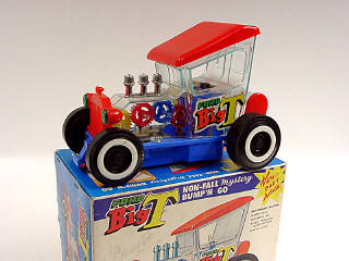 longueur 22 cm - en action, le tacot avance en contournant les obstacles - un système permet au véhicule de s'arrêter au bord de sa surface de roulement & de repartir dans une autre direction - avec éclairage du moteur - pignons mobiles (à revoir) - avec cales de boîte - in action, the buggy moves forward avoiding all obstacles - the vehicle automatically changes direction when it approaches the edge of a surface - motor lights up - moveable cogs (mechanism unreliable) - with box inserts
