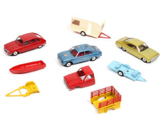 faisant partie des coffrets MAJOR - comprend notamment : OPEL, RENAULT, PEUGEOT (avec moteur à revoir - manque phares - décalques ajoutés), coque de bateau, remorque & caravane (avec manques)