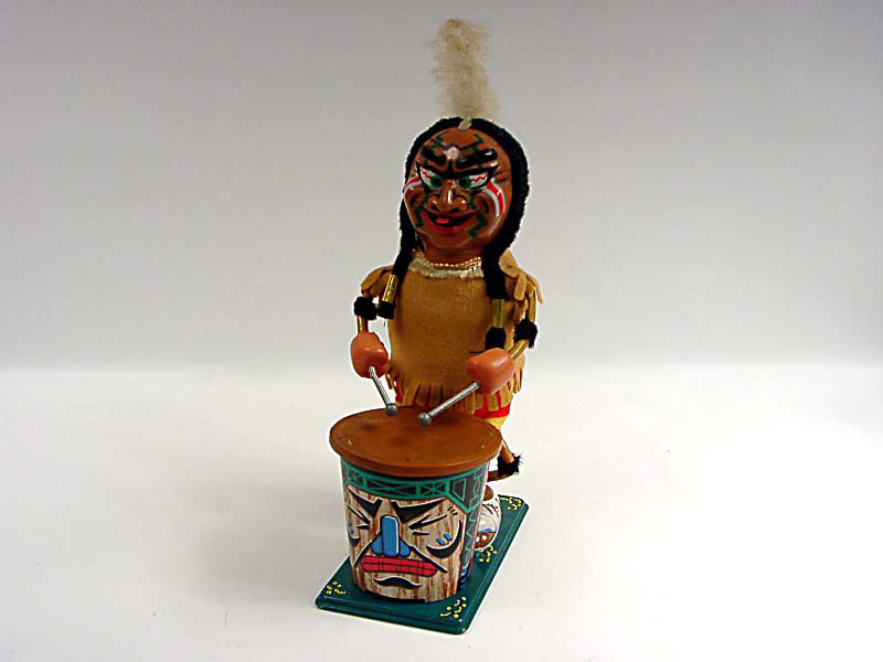hauteur 37 cm - en action l'indien joue du tambour & tire la langue - mécanismes fonctionnent - avec bruiteur - caoutchouc du tambour déchiré - in action, the Indian plays the drum & sticks out his tongue - in working condition - with sound effects - drum rubber torn