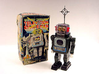 hauteur 39 cm - en action, le robot avance tandis que ses yeux tournent & qu'une télévision sur son torse fait défiler des images de planètes - avec éclairage de l'écran & de la bouche (fonctionne de manière aléatoire) - mécanismes fonctionnent - avec bruiteur - le contact s'effectue par l'insertion de l'antenne sur le crâne - cales de boîte - SUPERBE MODELE ! - in action, the robot moves forward, his eyes rotate & a TV on his chest displays pictures of the planets - the TV screen & mouth light up (in a random order) - in working condition - contact is made by inserting the antenna into the head - with box inserts & sound effects - SUPERB MODEL!