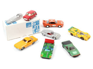 miniatures reproduisant notamment les modèles : MINI, CHEVROLET, BMW & PORSCHE - on y retrouve notamment les marques : SOLIDO, POLITOYS, CORGI TOYS & SMTS (kit à monter semble complet, boîte en état 'b')