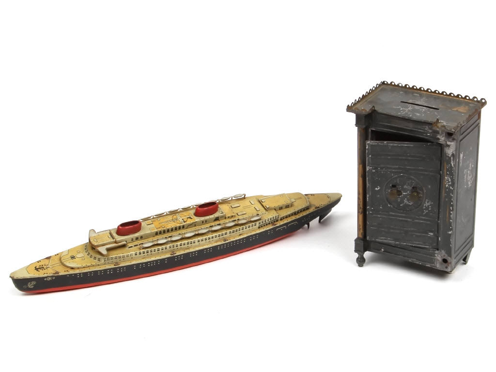 longueur 35 cm - sans moteur - quelques petites déformations sur le dessus du modèle & important frottement à l'avant du modèle - quelques traces d'oxydation - on y joint un coffre-fort faisant office de tirelire de la marque C.R en état 'F'
