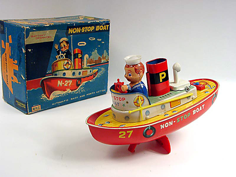 longueur 28 cm - en action, le bateau avance sur l'eau & change de direction lorsqu'il heurte le bord - le marin fait tourner la barre de direction - mécanismes fonctionnent - ce modèle n'a vraisemblablement jamais été utilisé sur l'eau - 2 petites fissures sur les parties plastique - avec mât amovible - in action, the boat moves forward in the water & changes direction when it touches an obstacle - the sailor turns the steering wheel - in working condition - this model has seemingly never been used in water - 2 small cracks on the plastic parts - with detachable mast