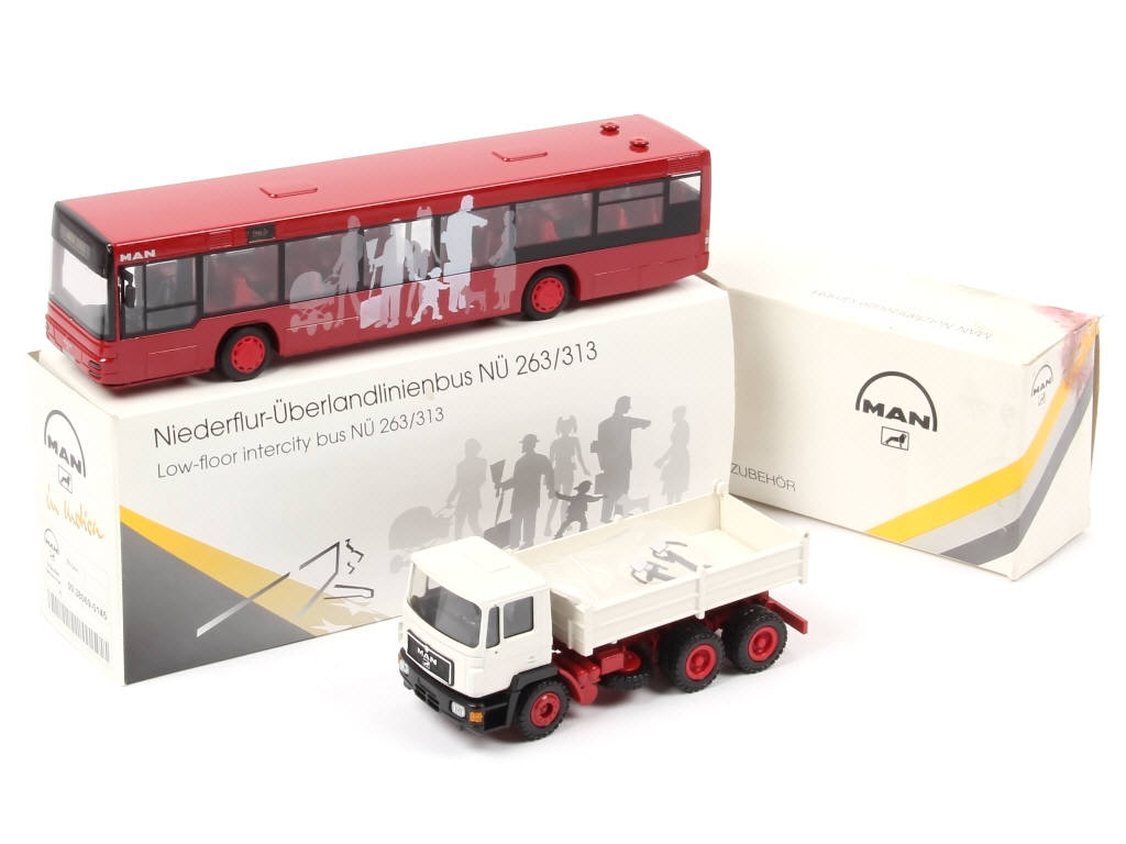 comprend les modèles : autobus 'NÜ 263' (une fixation de plancher déficiente) & camion benne basculante (avec sachet d'accessoires, boîte en état 'c' avec traces d'humidité)