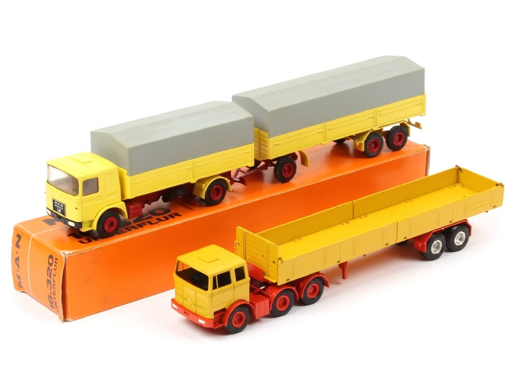 miniatures reproduisant les modèles : MERCEDES (manque roue de secours, sans vitrage) & MAN (en boîte état 'c') - on y retrouve notamment la marque CONRAD