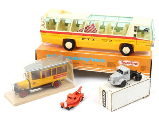 échelles différentes - on y retrouve notamment les marques : JOUSTRA (jantes légèrement fondues, moteur à friction fonctionne), DIANO & FAURIE - un exemplaire copie (JOUETS CITROËN) - quelques fêlures sur une boîte