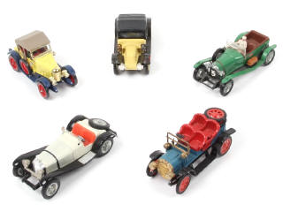 miniatures reproduisant les modèles : NAG, MORRIS, BENTLEY (une fixation cassée, manque capote), RENAULT (petites traces de peinture sur une aile) & MERCEDES - on y retrouve les marques : CORGI TOYS, DINKY TOYS, GAMA & ZISS MODELL