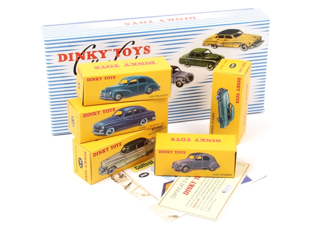 contient : FORD VEDETTE 1954, PEUGEOT 203, CITROËN 2CV, SIMCA ARONDE & BUICK ROADMASTER - avec cales de boîte, fascicule & certificat d'authencité