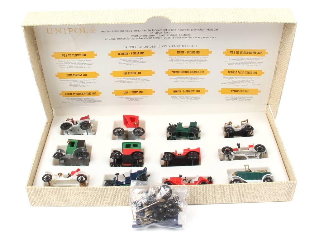 contient 12 tacots des marques CLE & DEL - distribué par UNIPOL & offert pour l'achat d'une bouteille de la marque HUILOR - quelques petits manques & parties cassées (plus ou moins importants suivant les exemplaires) - coffret légèrement taché - on y joint une FORD T à monter (sous sachet jamais ouvert)