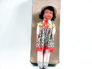 hauteur 29 cm - tête en composition (avec craquelures) - cheveux bruns - robe à motifs & chapeau de paille - membres articulés - provient d'un fond de magasin - 29 cm high - composition head (cracked) - brown hair - patterned dress & straw hat - movable limbs - original shop stock