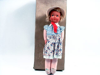 hauteur 29 cm - tête en composition (avec petites craquelures) - cheveux blonds - robe à motifs & chapeau de paille - membres articulés - provient d'un fond de magasin - 29 cm high - composition head (cracked) - blond hair - patterned dress & straw hat - movable limbs - original shop stock