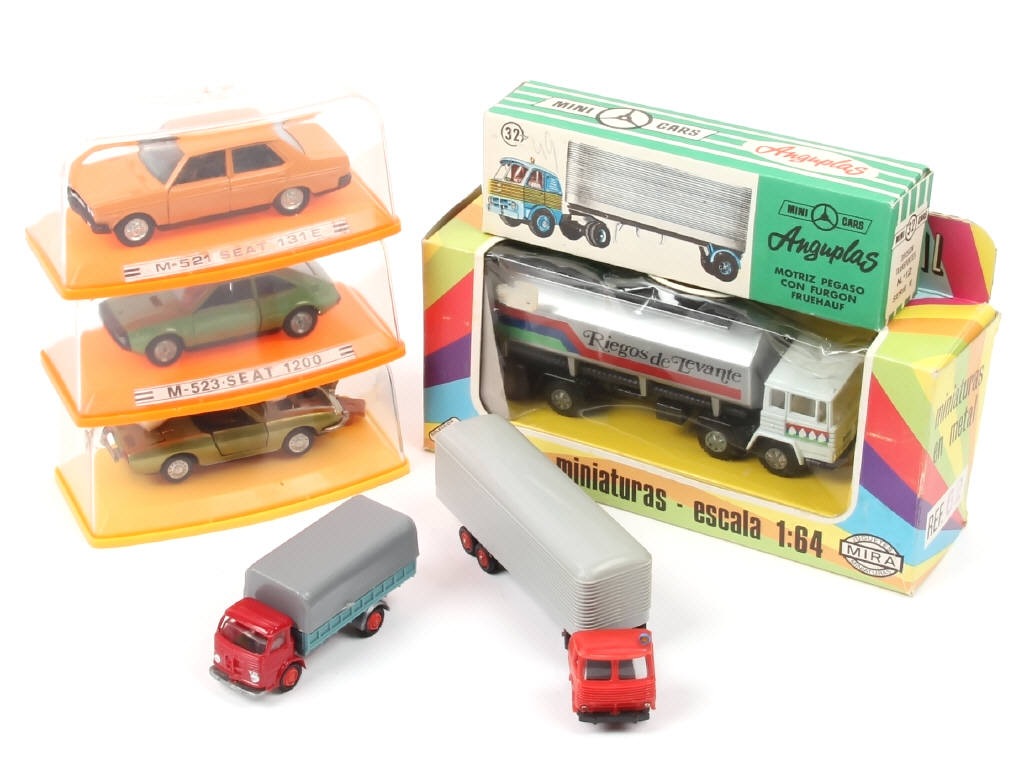 différentes échelles - miniatures reproduisant les modèles : SEAT (un exemplaire avec parties cassées & manquantes) & PEGASO (une fixation de cabine cassée sur un exemplaire, sans boîte) - on y retrouve les marques : PILEN, ANGUPLAS & MIRA - les boîtes sont en états de 'b' à 'c'