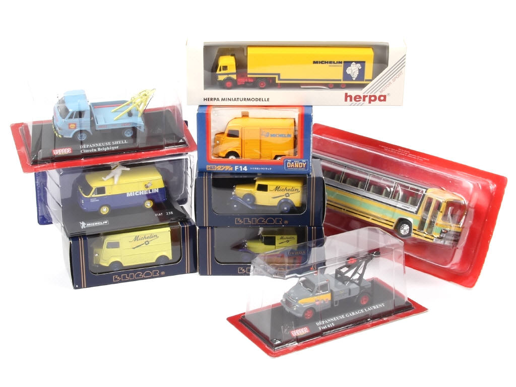 6 exemplaires 'MICHELIN' - miniatures reproduisant notamment les modèles : CITROËN, BERLIET & FIAT - on y retrouve notamment les marques : ELIGOR, EDITIONS HACHETTE & TOMICA DANDY - quelques boîtes en état 'c'
