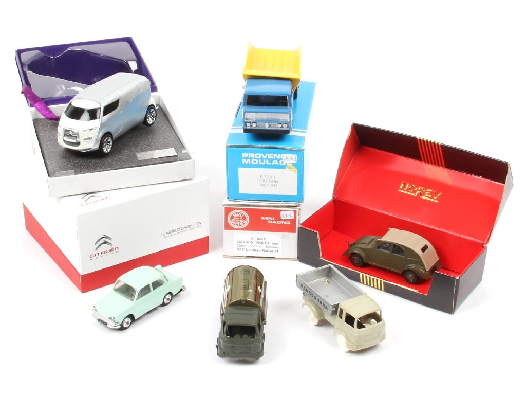 miniatures reproduisant notamment les modèles : DAF (carrosserie légèrement déformée), BERLIET (un exemplaire motorisé, fonctionne), CITROËN, DATSUN & TOYOTA - on y retrouve les marques : NOREV, SESAME, PROVENCE MOULAGE, MINI RACING & VEREM (jantes légèrement fondues) - 2 exemplaires à monter (semblent complets) - les boîtes sont en état 'b' (4 exemplaires sans boîte)