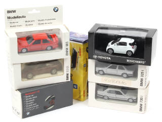 miniatures reproduisant les modèles : TOYOTA, BMW & GM - on y retrouve les marques : MINICHAMPS, ACTION & GAMA - manques de papier sur une boîte