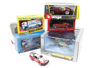 différentes échelles - miniatures reproduisant notamment les modèles : MITSUBISHI, PORSCHE, TOYOTA & JAGUAR - on y retrouve notamment les marques : PORTEGIES, BBURAGO & EDAI (modèle en état 'A') - certaines boîtes en état 'c'