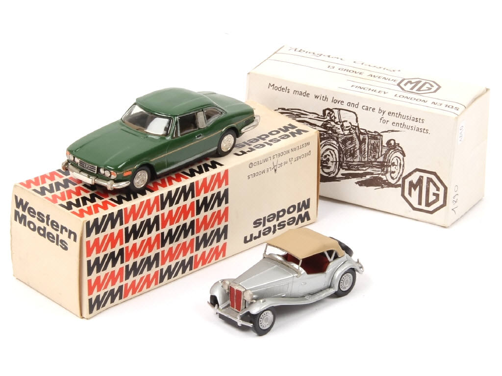 miniatures reproduisant les modèles : ROVER & MG - on y retrouve les marques : WESTERN MODELS (une étiquette collée sur un rabat de boîte) & ABINGDON CLASSICS