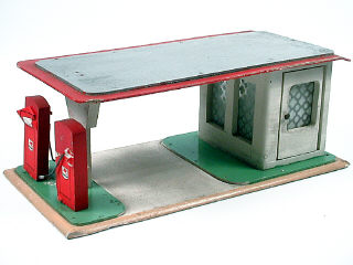 dimensions : 35 x 17,5 x 14 cm - une extrémité du toit écrasée - papier collant des pompes à essence en partie manquant - provient d'un fond de magasin - 35 x 17.5 x 14 cm - one end of the roof bent - paper attaching the pumps slightly incomplete - original shop stock