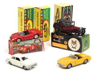 comprend : LANCIA LAMBDA 1925, FERRARI MONZA, NSU TYP 10, FORD LOLA GT & ISO GRIFO - on y retrouve les marques : MERCURY, POLITOYS & DUGU - les boites sont en états de 'a' à 'c' (manque quelques mousses de protection)