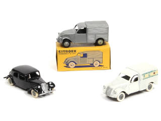 comprend les modèles : traction 11CV (état 'A'), 2CV fourgonnette dont un modèle 'TCF' en état 'C' (avec retouches par endroits) & un autre en état 'R' (boite en état 'b' avec petites déformations) - jantes plus ou moins ternies - quelques pneus séchés & d'autres non conformes