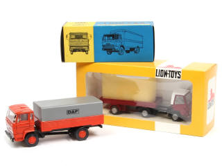 comprend : 2000/2200 bâché 'DAF' (petits manques de peinture sur les jantes) & PONY plateau à ridelles basses - on y retrouve les marques : LION-TOYS & LION-CAR