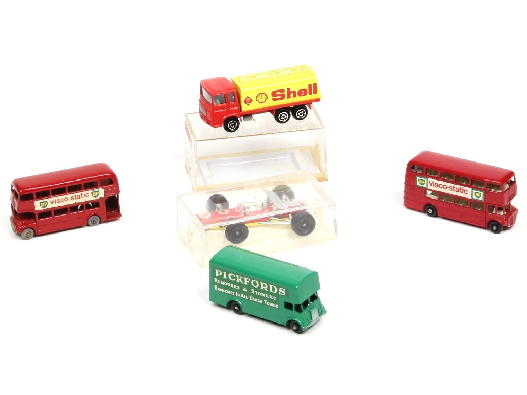 comprend : GUY camion de déménagement 'PICKFORD'S' (léger manque sur un décalque), ROUTEMASTER LONDON bus 'VISCO STATIC', LOTUS & DAF citerne - on y retrouve les marques : MAJORETTE & MATCHBOX - 2 modèles en boites état 'b'