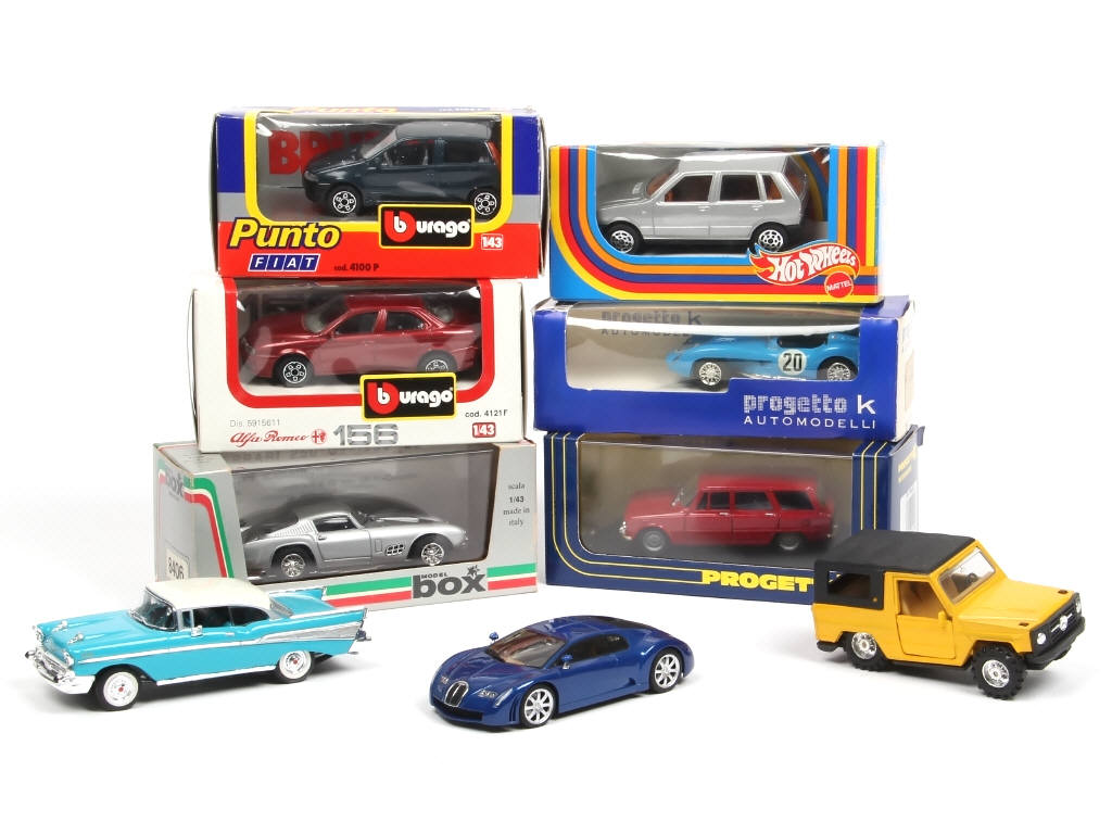 comprend les modèles : FERRARI, FIAT & ALFA ROMEO, MERCEDES, CHEVROLET & BUGATTI - on y retrouve notamment les marques : AUTOART, ERTL, BBURAGO, PROGETTO K & MATTEL - quelques accrocs sur certaines boites (3 modèles sans)