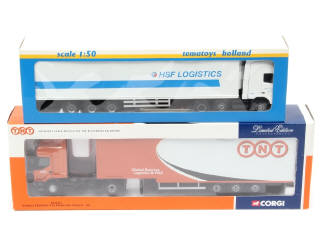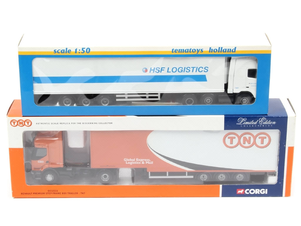 comprend : VOLVO FH12 fourgon frigorifique 'HSF LOGISTICS' & RENAULT PREMIUM fourgon 'TNT' - on y retrouve les marques : TEMATOYS & CORGI TOYS - avec sachets d'accessoires