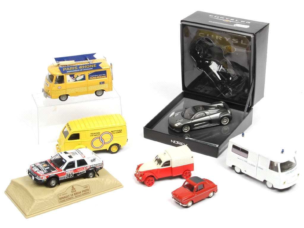 comprend : CHRYSLER M-E 2004, RENAULT 18 break proto 'Paris-Dakar 1985', PEUGEOT J7, CITROEN 2CV AZU & VESPA 400 - on y joint un RENAULT 1000 KG de la marque MACADAM - 2 boites en état 'b'