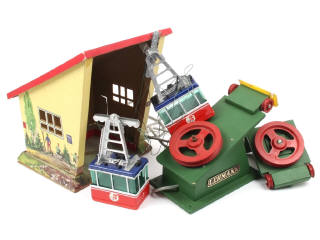 moteur électrique non testé - comprend : 2 cabines en tôle (autocollants ajoutés), un abri & 2 accessoires - avec manques & parties cassées