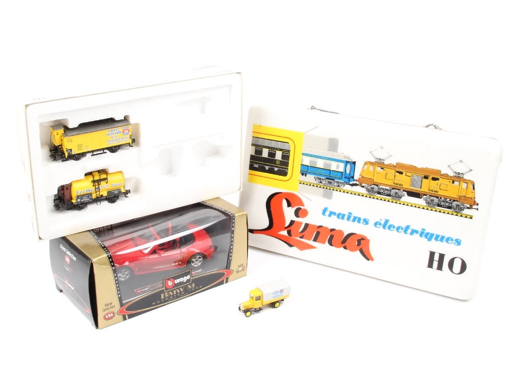 différentes échelles - on y retrouve les marques : BBURAGO (BMW Z3 roadster) & MÄRKLIN (2 wagons & un camion, sans autre accessoire) - on y joint une enseigne lumineuse de magasin LIMA (non testé, sans boîte) de la marque NOVA PLEX (prise électrique incomplète, quelques éléments intérieurs désolidarisés)