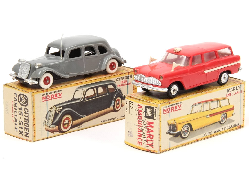 comprend : CITROËN TRACTION 15 SIX FAMILIALE (pare-chocs avant & plaque minéralogique arrière retouchés, pare-chocs arrière cassé & incomplet, une petite fêlure sur le bas de caisse, manques de peinture sur le plancher) & SIMCA MARLY ambulance (légère décoloration de la carrosserie, jantes très légèrement fondues, avec brancard) - carrosseries légèrement déformées
