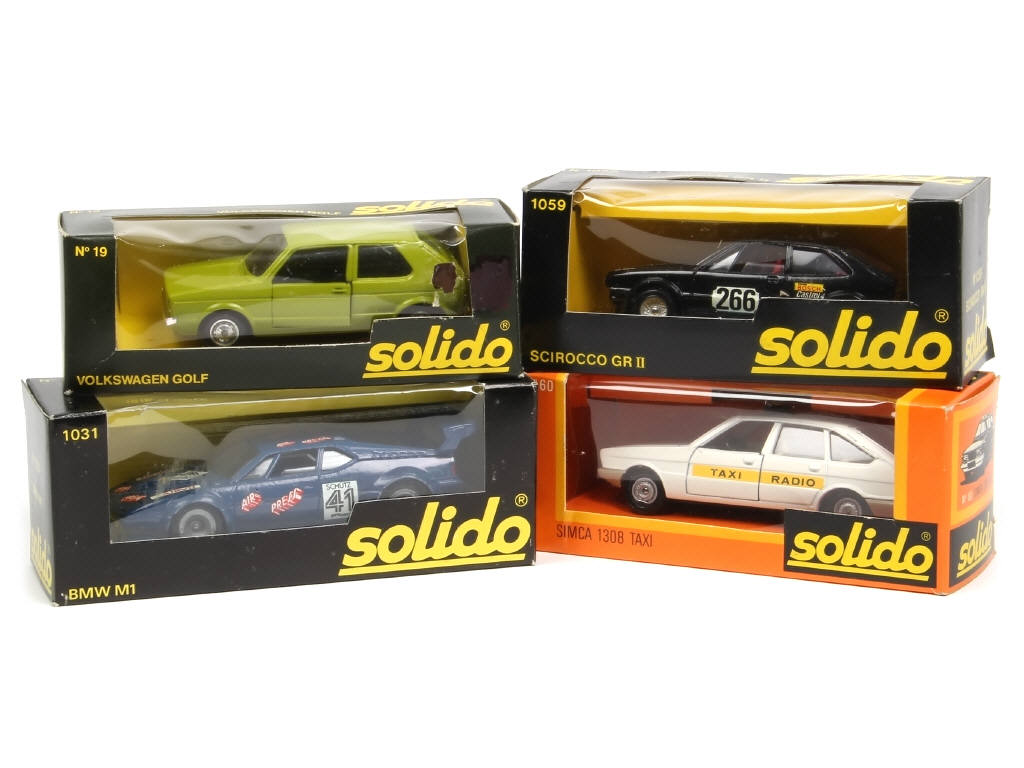 comprend : SIMCA 1308 TAXI, VOLKSWAGEN GOLF, SCIROCCO GR II & BMW M1 - une boite avec étiquette collée sur le blister