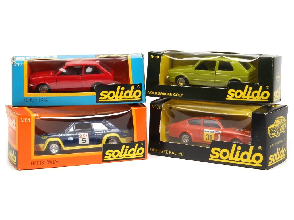 comprend : VOLKSWAGEN GOLF, OPEL GTE rallye, FORD FIESTA, FIAT 131 rallye - une boite avec étiquette collée sur un rabat