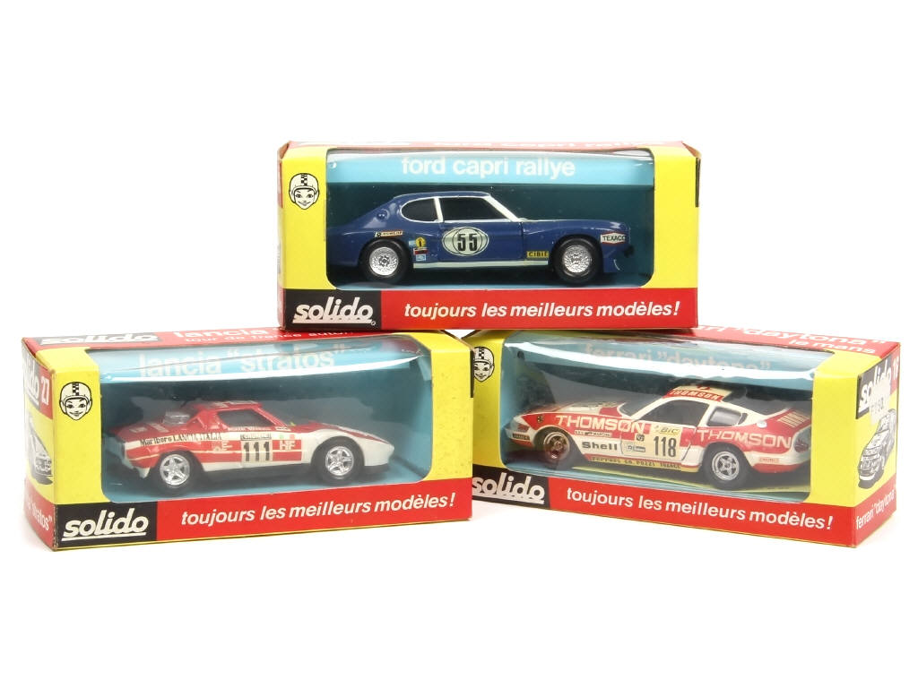 comprend : FERRARI 'DAYTONA', LANCIA STRATOS (avec parties repeintes) & FORD CAPRI rallye - très léger manque de papier sur un rabat