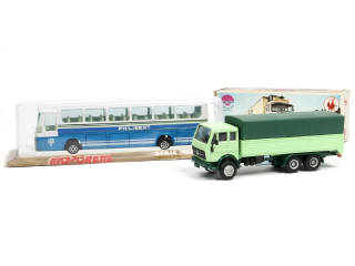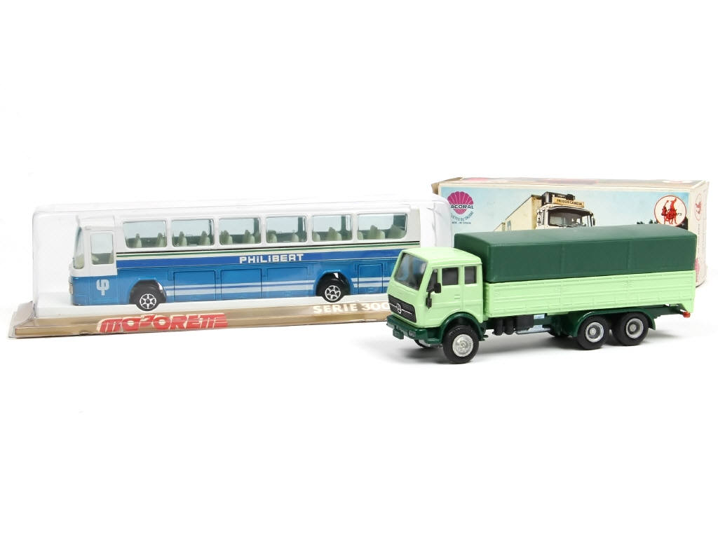 comprend : autobus MERCEDES 'PHILIBERT' & SCANIA LBS 141 bâché - on y retrouve les marques : MAJORETTE & NACORAL - une boite en état 'c'